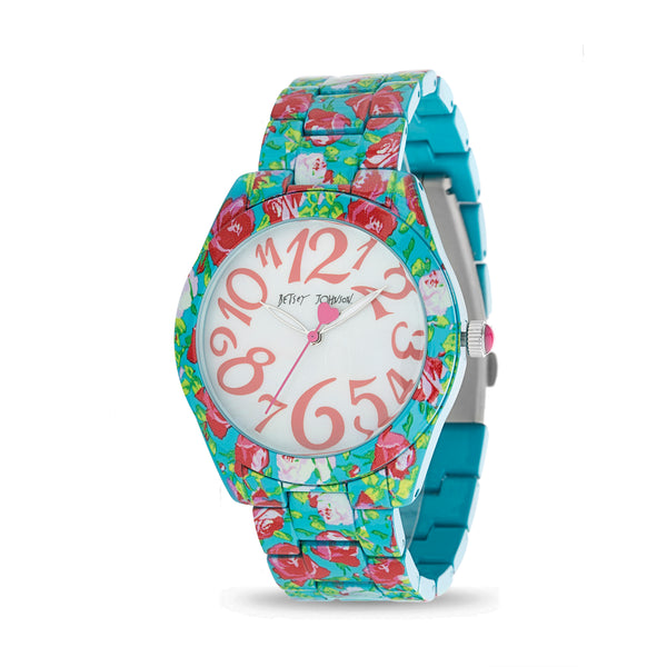 Betsey Johnson Glossy Multi Color Floral Print Case and Link Strap Watch with Mop Dial with Pink Numbers for Women