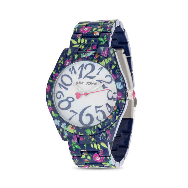 Betsey Johnson Glossy Navy and Multi Color Floral Print Case and Link Strap Watch with Mop Dial with Blue Numbers for Women